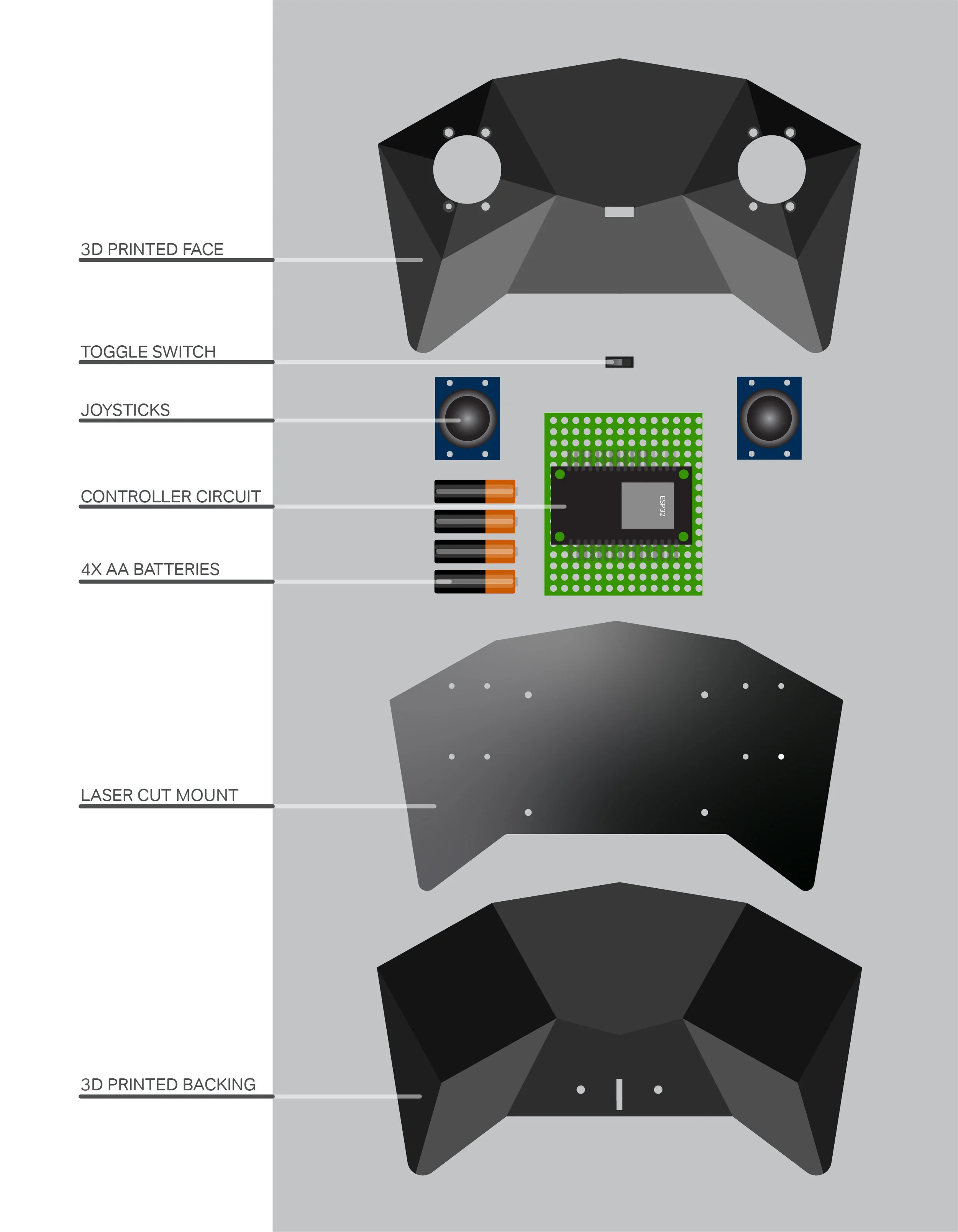 The controller was designed mainly to house the joysticks and circuitry, but in an ergonomic form that alluded to the racer’s visual language. An unobtrusive toggle switch was added to increase usability and preserve battery.